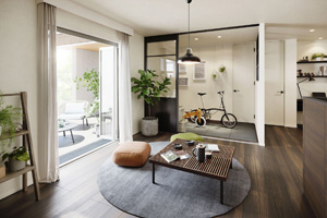 ■「BE Resi(ビ レジ)」の特長 (1)「マイスタイル」 ご入居者のライフスタイルに合わせ、自分好みに棚の位置を変えられる収納棚やテレワーク時のデスクにもなる「ウォール収納デスク」を用意しました。 また、リビングと一體化した土間スペースやバルコニーなど、內と外がつながる開放感のある空間を提案します。 |