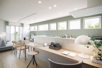 (4)「マルチストレージ」 テレワークにより新たに増えた、仕事や趣味のグッズをはじめ、暮らしの変化に順応できる備え(ストック)に対し、棚位置が可変できるマルチストレージを用意しました。 また、欲しい場所に収納がある「適所適納」のプランやアイテムも提案します。 |