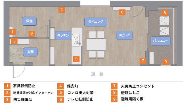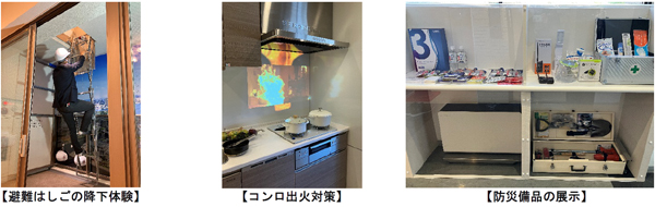 ①火災対策の主な取り組み ?バルコニーに設置されている避難はしごを利用した下階への避難方法 ?バルコニーに設置されている隔て板(パーテーション)での避難方法 ?キッチンでの火災対策 ②地震対策の主な取り組み ?地震時でも歪みにくい耐震枠(玄関)を設置 ?家具の転倒防止方法 ?地震時におけるブレーカーの作動體験 ③在宅避難の主な取り組み ?防災備品の備え方や設置場所 ?分譲マンション共用部における防災備品の展示