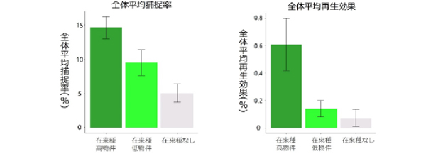 2.在來種植栽率と捕捉率?再生効果の評価 今回の調査では、在來種の植栽率が高いほど捕捉率と再生効果が高いことが確認できました。在來種の植栽率が50%以上の在來種高物件(30物件)においては、在來種の植栽率が30%以下の在來種低物件(5物件)や在來種が植栽されていない物件(5物件)(※11)と比較して捕捉率が1.1~3倍、再生効果が3倍以上となりました。(※12) ※11.在來種低物件における在來種を外來種植栽樹種に置き換えた場合の物件。 ※12.樹種?鳥類種?チョウ類種の平均捕捉率および平均再生効果。