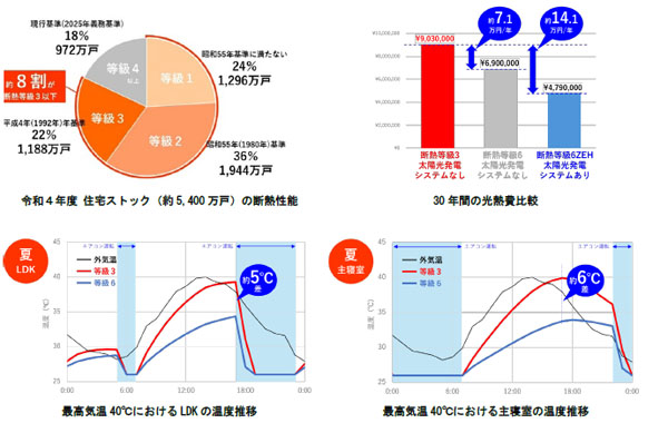 ※6. 國土交通省調査によるストックの性能別分布を基に、住宅土地統計調査による改修件數および事業者 ※7. 一部木造商品では135mm。 ※8. 試算條件:溫熱環境シミュレーションプログラム「AE-Sim/heat(エーイーシムヒート)」にて試算。 ※9. 試算條件:當社光熱費算出ツール「ecoナビゲーター」にて試算。試算條件及び時期により異なる。 |