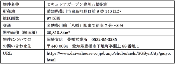 當(dāng)社は愛(ài)知県豊川市において、防犯面に配慮した全97區(qū)畫(huà)の戸建住宅分譲地「セキュレアガーデン豊川八幡駅南」(以下、本分譲地)の開(kāi)発を進(jìn)めています。