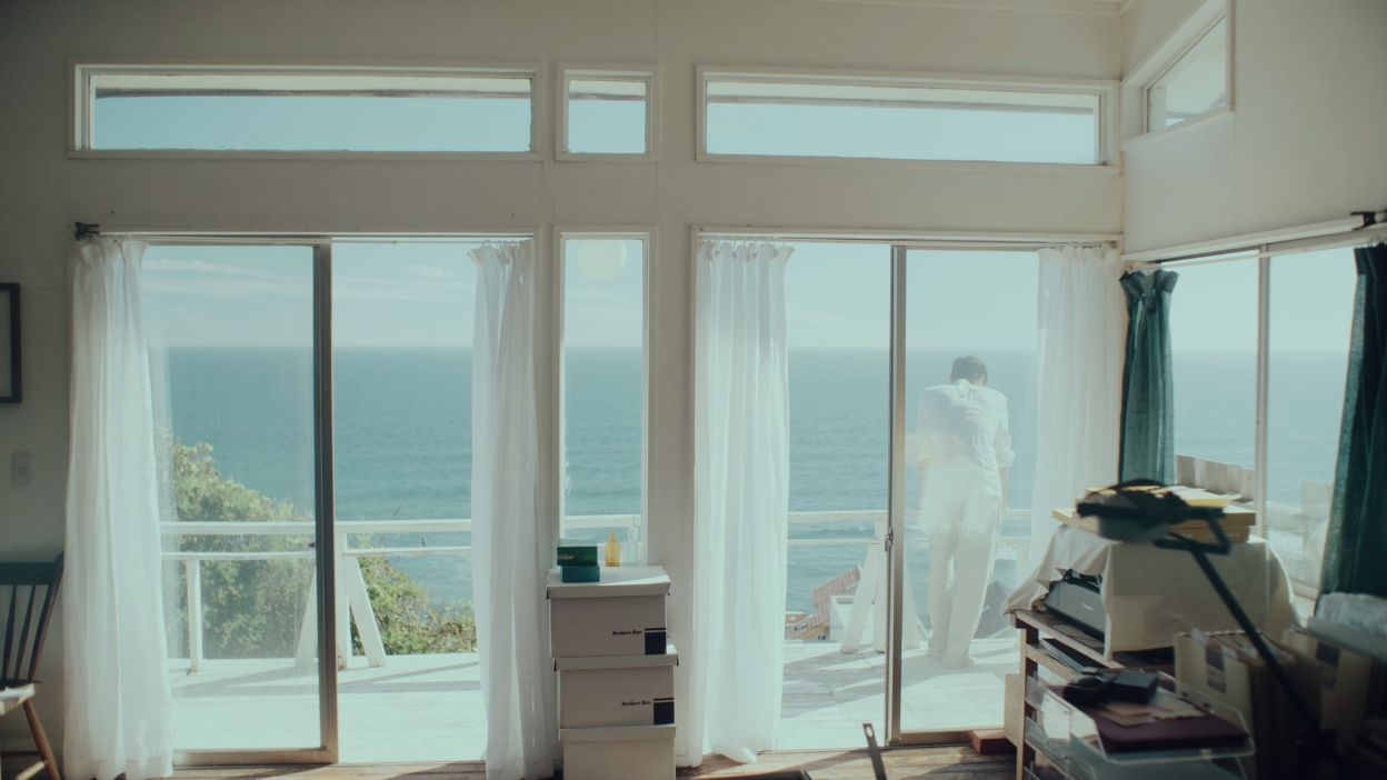 機に向かい、悩みながらペンをとり、母との物語を書き始める外國人の男。