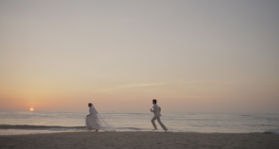 「とにかくそういうことなの」という一言で、教會を飛び出す2人。美しい砂浜をウエディングドレスとタキシードで走る2人。