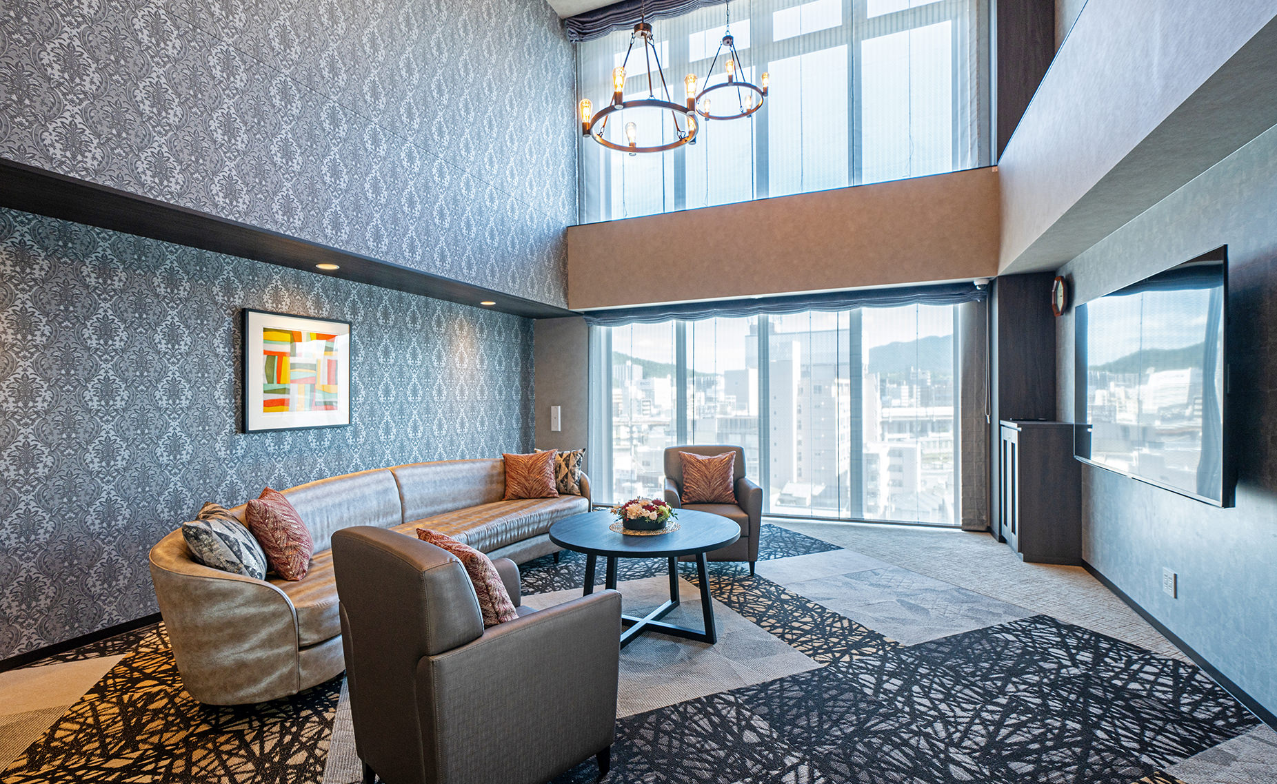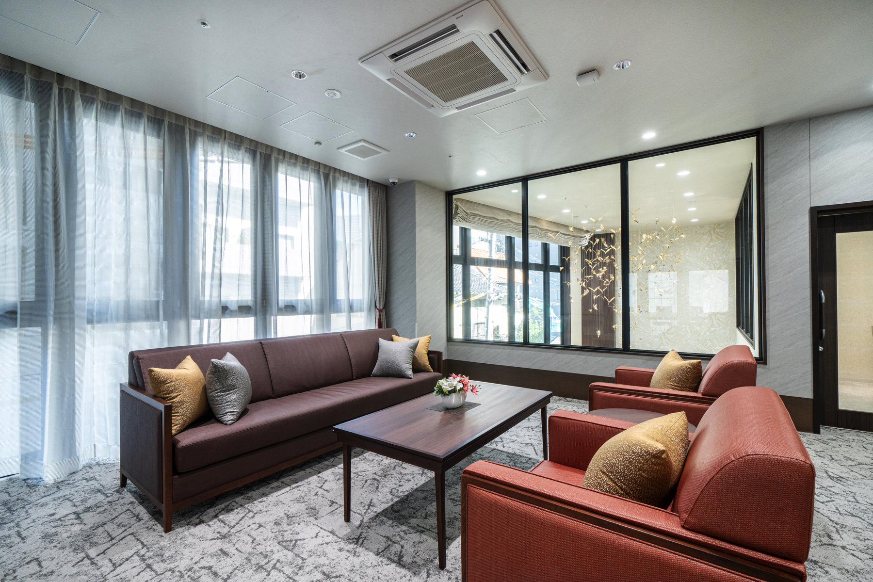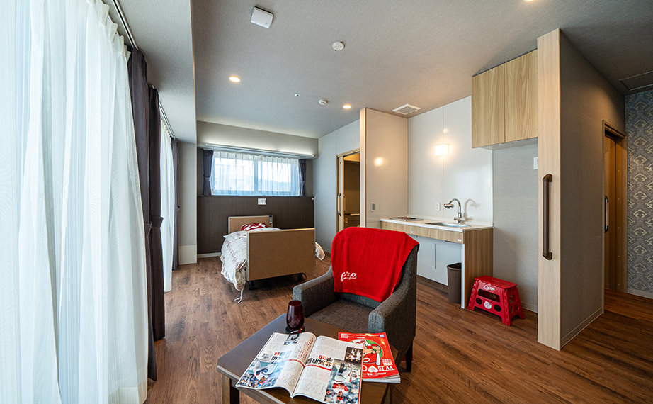 施設內は、開放的なダイニングや吹抜けのある共用部、屋上にはリハビリスペースを設け、街中に立地する施設において、外部空間を感じることができ、開放的で非日常的な空間となるように計畫しました。