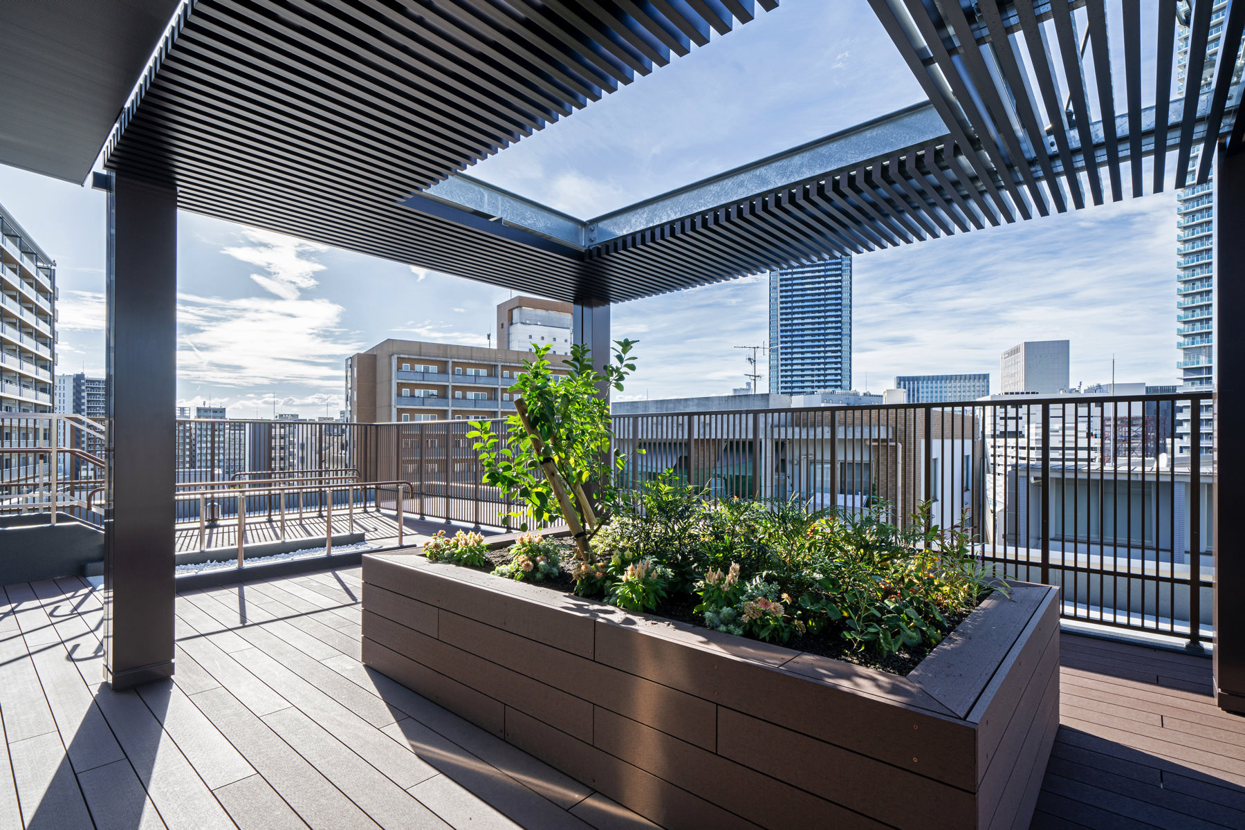 具體的にはバルコニーをシンプルな形狀であるRCバルコニーとし、バルコニーに3本のマリオンを配置し、広島に由來する「三本の矢」を想起させる外観とさせ、入居者が生活する上層階とエントランスや共用部のある下層階の外観に一體感を持たせました。