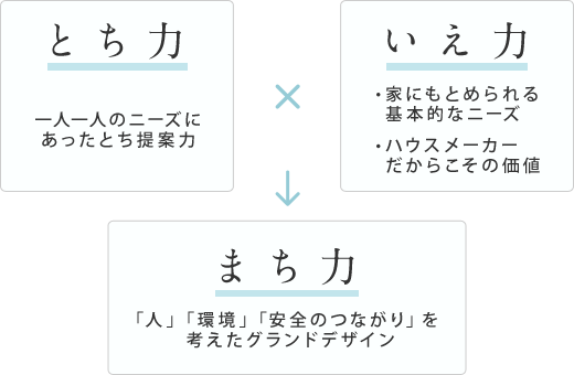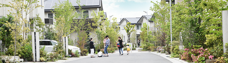 そして「まち」。住民がふれあい、笑顔が生まれる。 それはまちぐるみで「人」「環境」「安全のつながり」を考えたグランドデザイン。 末永く、心から安らげる、安心?安全を築きます。