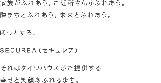 裸足になれる場所がある暮らし。 それがSECUREA。 子どもが笑顔で駆け回ることができるまち。 それは人と人、家族と家族がふれあえるまち。 ほっとするまち。 そのシンボル、それがハダシバフ。