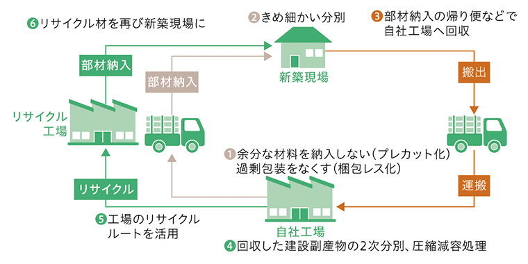 ※住宅などの建設現場で出た建設副産物を、部材納入の自社帰り便等で自社工場へ回収し、工場のリサイクルルートを活用して現場廃棄物のゼロエミッションを目指すシステム。