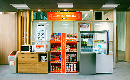 オフィスの一角に、置き社食?ミニコンビニを設置して、勤務時間が不規則な従業員の食事の悩みを解消します。拠點ごとの待遇格差をなくし、働きやすい環境をつくることで従業員満足度の向上、オフタイムのコミュニケーション活性化も期待できます。