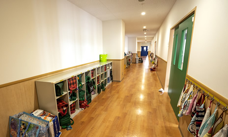 建物脇に位置するバディスポーツ幼児園の入口。多くの園児たちを迎える玄関は、明るく広々としています。
