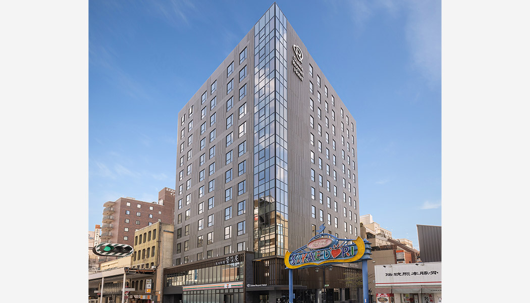 當ホテルは熊本市內の繁華街にあり、利便性が高い立地です。熊本地震で大きく被害を受けた商業施設の跡地に、土地オーナー様の「震災から復興し、街に人を呼び戻したい」という想いを受けて開発されました。外観は「熊本城」の「いぶし瓦」をイメージした銀色と木の溫かみを組み合わせ、內壁は黒を基調とし、熊本らしさを感じられるデザインです。