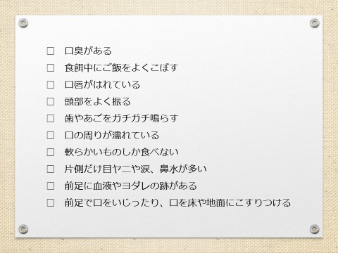 思い當(dāng)たる項(xiàng)目があったら、歯周病の可能性あり。動(dòng)物病院で歯科健診をしてもらいましょう。