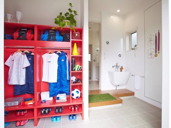 また、ロッカーベンチはアクティブ土間に設けるので、汚れものや臭いが気になる用具を室內に持ち込まずに済みます。