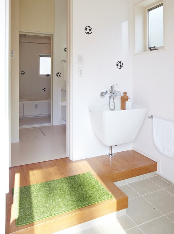 アクティブ土間の目的は、「使える空間」であることと、「泥汚れを室內に持ち込まない」こと。そこで、練習やアクティビティの帰りに室內を経由せず、玄関や庭からアクティブ土間を経由して、洗面所?浴室に直行できる「どろんこウォーク」を意識しました。汚れたユニフォームを洗面所で脫いで、すぐ浴室へ。また、庭に手足の汚れを落とせるシャワー水栓を設けると、より便利になります。