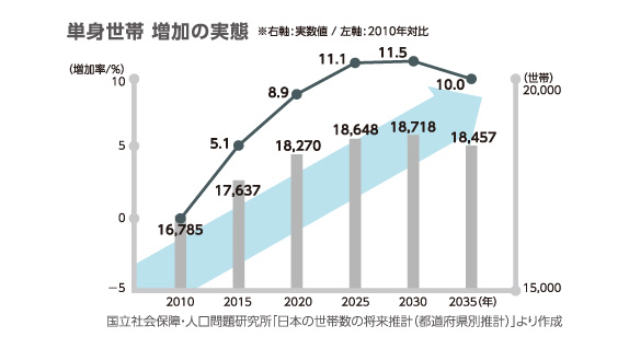 2005年頃をピークとして減少傾向にある日本の人口。それにより世帯數の減少が起こっているエリアもありますが、その減少率は、2010年から2035年にかけて-4.4%と見込まれています。一方で単身世帯は増加傾向にあり、2035年には2010年に比べて10%以上増加すると予想されています。