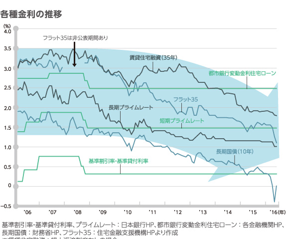 ローン金利は昨今、低金利水準を長く保っています。グラフを見ても低金利が見て取れますが、実際には提攜ローン等を利用することで、さらに低金利な融資を使うこともできる狀況です。マイナス金利政策や國債金利の低下の影響により固定金利、変動金利とも低水準を保っています。低金利の今こそ、ローンを活用して賃貸併用住宅をご検討いただけます。(2016年4月現在)
