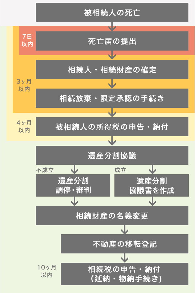 被相続人の死亡→死亡屆の提出(7日以?xún)?nèi))→相続人?相続財(cái)産の確定→相続放棄?限定承認(rèn)の手続き(3ヶ月以?xún)?nèi))→被相続人の所得稅の申告?納付(4ヶ月以?xún)?nèi))→遺産分割協(xié)議→[不成立]遺産分割調(diào)停?審判/[成立]遺産分割協(xié)議書(shū)を作成→相続財(cái)産の名義変更→不動(dòng)産の移転登記→相続稅の申告?納付(延納?物納手続き)(10ヶ月以?xún)?nèi))
