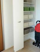 靴はもちろん、ベビーカーも玄関の収納へ。子どもを玄関の上がり框に座らせてから、ベビーカーをしまえます。