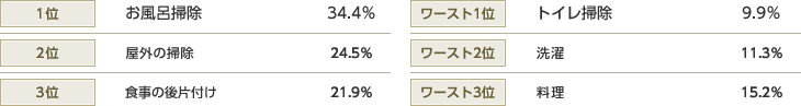 お風呂掃除は、毎日入るついで、でしょうか。2位「屋外の掃除」、3位「食事の後片付け」や、「蝶番に油を差したり、電球を交換したり、家のメンテ全般(40代女性)」「車の掃除やパソコン周辺機器の設置(20代女性)」といった家事や、買い物に行く時の車の運転などが、男手が期待される分野のようです。