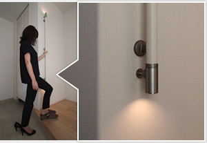 玄関手すりと照明を一體化し、足元を見やすく。