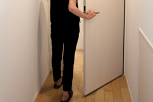 もう一つの特長は引手です。実験によると、ドアを開ける時と後ろ手で閉める時では、手の高さが20cmくらい違うので、引手の位置が高いと後ろ手では閉めにくく、わざわざ振り返って閉めなくてはなりません。「フレンドリーデザイン引手」なら、引手がドアの上から下まで通っているので、どこでも手を掛けられます。つまり、人が建物に合わせるのではなく、建物が人に合わせるデザインなのです。