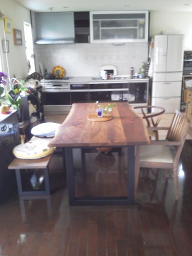 最近購入したウォールナットのテーブル、椅子を置いた我が家のリビングです。