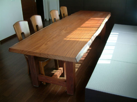 我が家のダイニングでのこだわりは、おおきなテーブル&寢転がることができるイスを置くことでした。寫真の右側が、寢転がるための畳です。