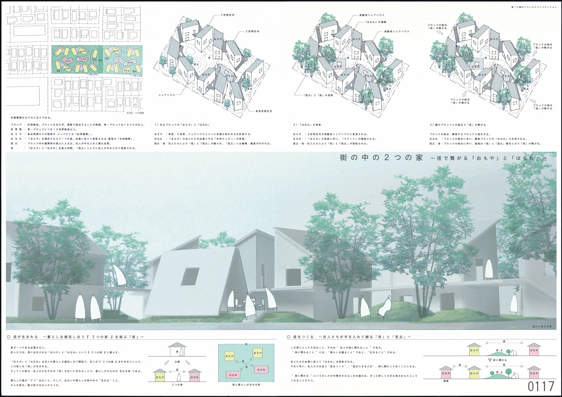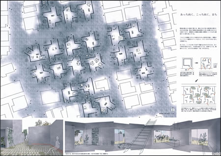 家がひとつである必要はない。住人たちは、街に點在させた「おもや」と「はなれ」という「2つの家」に暮らす。「おもや」と「はなれ」は住人の暮らしを補完し合う関係で、住人が「2つの家」を行き交うことで、この街には「徑」が生まれる。そして、住人のそれぞれの「徑」が互いに交わることで、暮らしそのものが交わる街になる?! 。?応募案より抜粋)