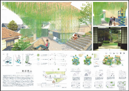 東京に里山のような「町の生産機能」をつくることを提案する。土地の狹い東京には食糧を自給するだけの畑を用意することはできないが、近年開発が進んでいるオイル産生緑藻類を利用すると生活に必要なエネルギーを自給することが可能になる。このようなバイオマスエネルギーは生産コストに課題があるとされるが、庭先の盆栽栽培や自家菜園のような生産システムに載せることができる場をつくれば「エネルギーを自給する経路」が「暮らしの楽しみ」とリンクする。
