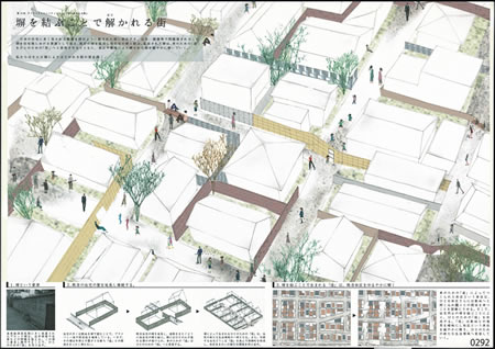他の街から來た人がこの街の道を通った時に、ワクワクしたり期待感をもてるかを重視し、「塀を結ぶことで解かれる街」と「ケモノミチノマチ」が候補となりました。「塀を結ぶことで解かれる街」は、塀を延長して敷地の中に道を取り込み、住んでいる人びとが自由に使えるようになるという、道と敷地の関係を曖昧にする提案で共感しましたが、「ケモノミチノマチ」の、設計者や都市計畫家が道や街をつくるのではなく、そこに住んでいる人たちが自分たちでつくっていくという主體のあり方を評価して、最終的に「ケモノミチノマチ」を「大和ハウス工業賞」に選ばせていただきました。