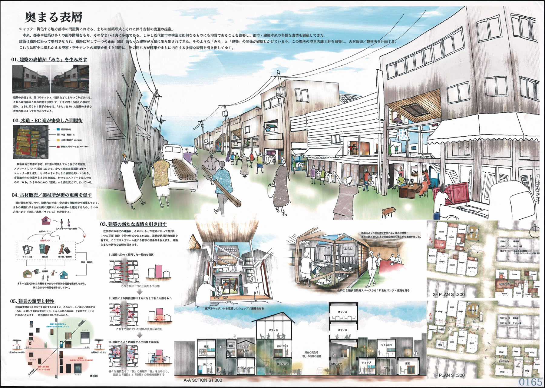 シャッター街化する地方都市の更新とそれに伴う古材の流通の提案。岐阜県岐阜市にあるシャッター通りの一角に、古材の販売や製作を行う古材バンクを新たに計畫し、街の更新性の向上を図る。古材バンクは建物の減改築によって出る建具や木材を買い取り、新たな製材を規格化し、流通させ