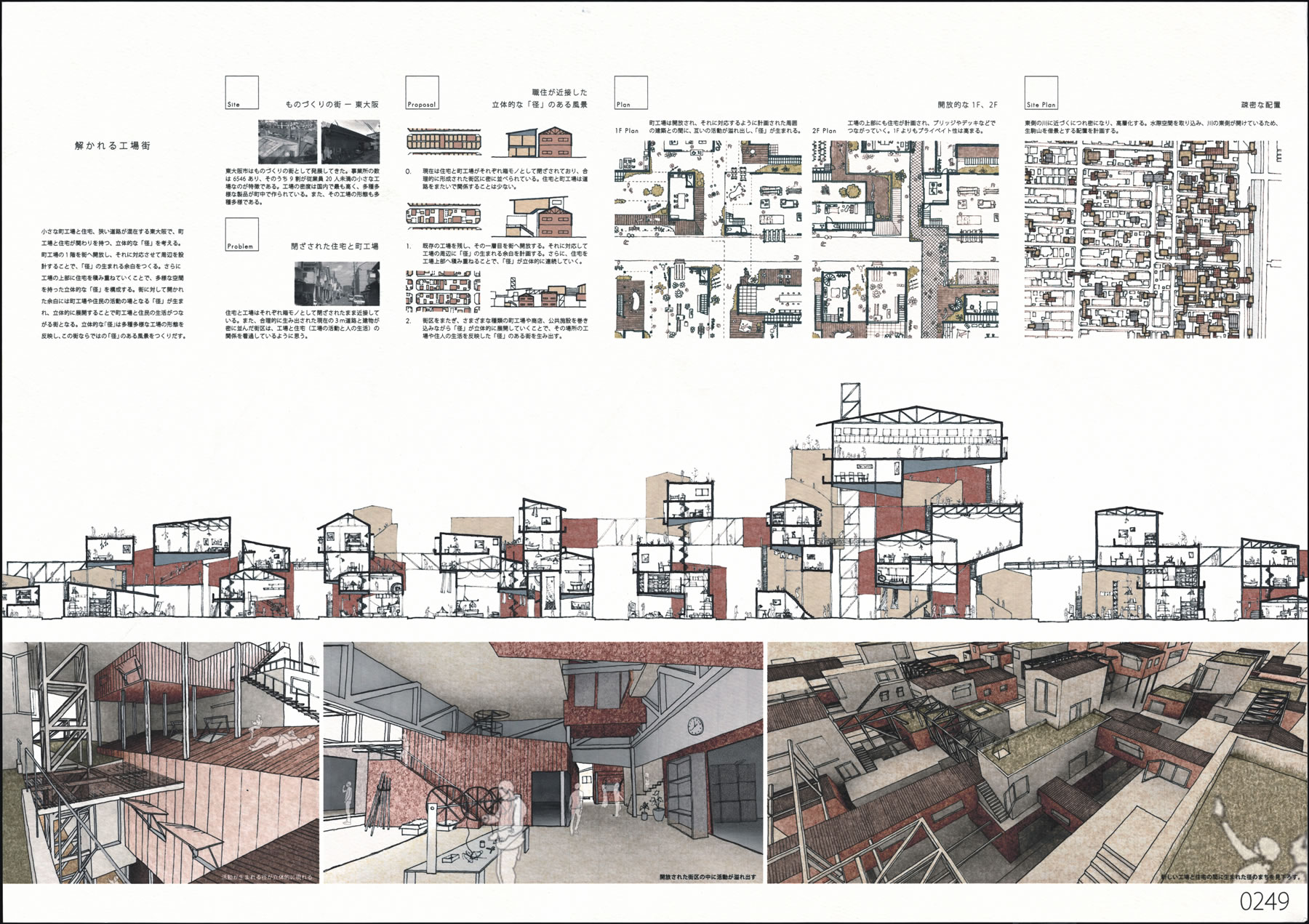 町工場という地域の資源に著目し、町工場を周囲に開放することで徑の生まれる街の風景をつくる。敷地はものづくりの街、大阪府東大阪市。バブル崩壊以後、多くの町工場が閉鎖され、工場跡地はベッドタウンとしての開発が進められ、住工混在地域となっている。この住工の入り交じり方を新たに考える。既存の町工場を街に開放し、増加が見込まれる住宅を積層する。その隙間にそれぞれの機能が重なり合うような場をさまざまなレベルで設ける。外部をまたぎ、地元の商店や公共的な施設を巻き込みながら、場が広がっていく。人びとの活動がそうした場に反映し、その曖昧な道が、徑となって新しい街の風景をつくっていく。