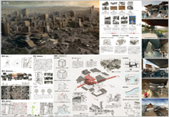 これまで日本の住宅は社會的背景やライフスタイル、技術の発展に応じて姿を変えてきたが、これから目指すグローバル社會においての住まいの環境はどうなるのだろうか。そこで外國人が街に融和することができるような建築を提案する。敷地は大阪の上町臺地に位置する寺町?夕陽丘。さまざまなヴォリュームと多方向からのアクセスが可能な道、大きな屋根で構成された舞臺建築を建てることで、既存の街のよさを発見し、日本人と外國人が交流できるパブリックスペースをつくり出す。 (応募案より抜粋)