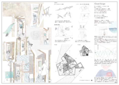 先日、五十嵐太郎氏の「景観を笑う」という巻頭論文(『新建築』0412)を読みました。その中で、チェコ出身の作家であるミラン?クンデラの「ふたつの笑い」を引用していました(『笑いと忘卻の書』、集英社、1992年)。「悪魔の笑い」は無秩序でキッチュなものを笑うアイロニーであり「天使の笑い」は秩序や人生の価値、不滅性を稱揚する微笑みです。しかし、どちらかの笑いで埋めつくされた世界は悲劇にもなります。笑いにはそのようなある意味での暴力性も孕んいるともいえます。その點において、最優秀賞の「余白と結構Ⅰ」は秩序立つプランニングと斷片の間に生じる運動が何に繋がるのか分からない風景を描いており、いちばん興味をそそられました。また、優秀賞の「空中アトリエ」は建築のいろいろな見方を提示してくれました。