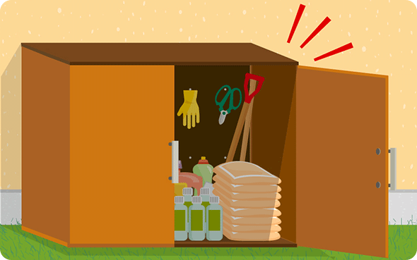 お庭やベランダにある物は散亂しないように片づけ、屋內にしまえるものは収納しましょう。
