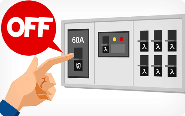復(fù)舊時は通常時と同じ手順で、アンペアブレーカー→メインブレーカー(漏電遮斷器)→安全ブレーカーの手順で「入」にし、漏電箇所がないか確認しましょう。