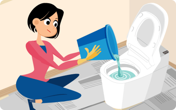 斷水中は水を使用できなくなり、通常の便器洗浄ができなくなります。そのような場合には水を流し込むことで、便器洗浄が可能です。バケツ1杯(8L程度)の水を?水飛びに注意しながら直接便器內(nèi)へ一気に流し込んでください。さらに靜かに3~4Lの水を流してください。小便はまとめて流し、トイレットペーパー等は流さずごみとして捨てます。