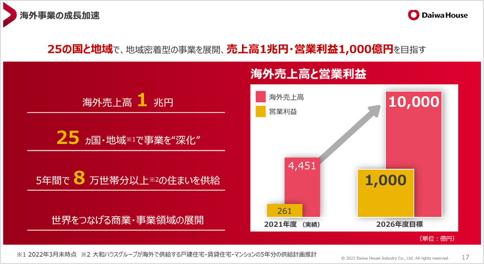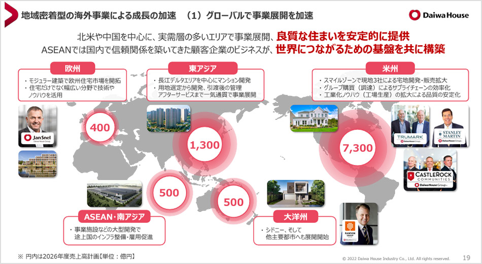 1960年代にスタートした大和ハウスグループの海外事業は、2010年代から現在にかけて順調に拡大を続け、2026年度に1兆円の売上高達成を目指します。グループの成長と飛躍を擔うため、私たちは「共に創る。共に生きる。」というグループの基本姿勢に基づいた方針「STAY&EXPAND」を掲げ、これからの事業を進めたいと考えています。