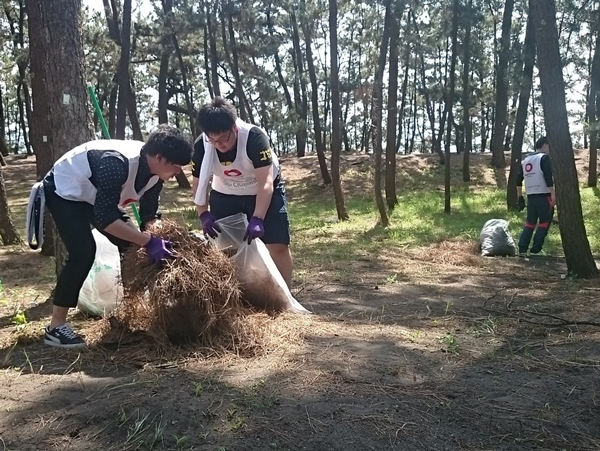 月に1度、靜岡新聞社とNPO法人羽衣村が行っている三保の松原保全活動に參加させていただいています。松葉の回収、雑草の処理など、世界遺産である三保の松原を守る活動のお手伝いをさせていただいています。