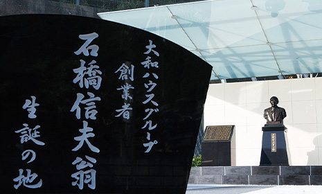 2021年に創業者生誕100周年を迎えるにあたり、生まれ育った奈良県吉野郡川上村に記念碑を建立しました。今は無き生家の方角を望む胸像や陶板モニュメントを設置。創業者の足跡を後世に語り継ぐとともに、大和ハウスグループが次の100年へ向かう新たな起點となっています。