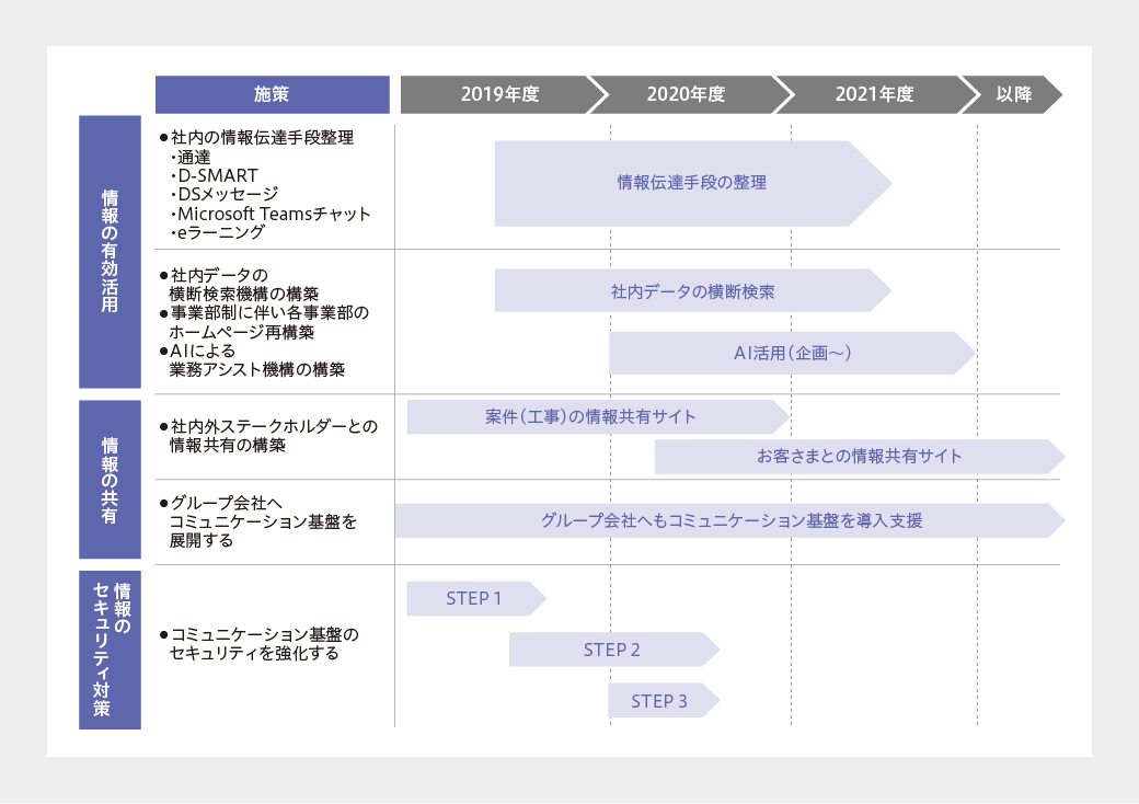 情報の有効活用の分野では、業務に必要とされる事例や提案書類などのナレッジやノウハウの情報を橫串で検索でき、タイムリーに確認できるようにすることで業務品質の向上を図ります。重要情報?新著情報を一元化するとともに、既読確認機能により伝達漏れを防止することで業務スピードの向上を図ります。
