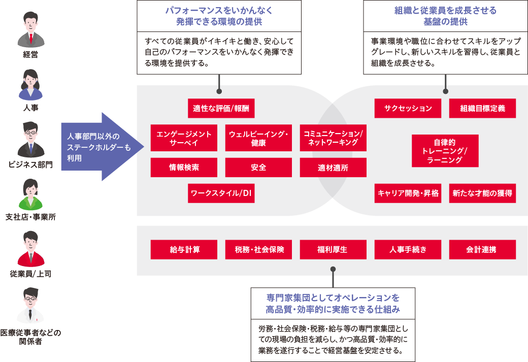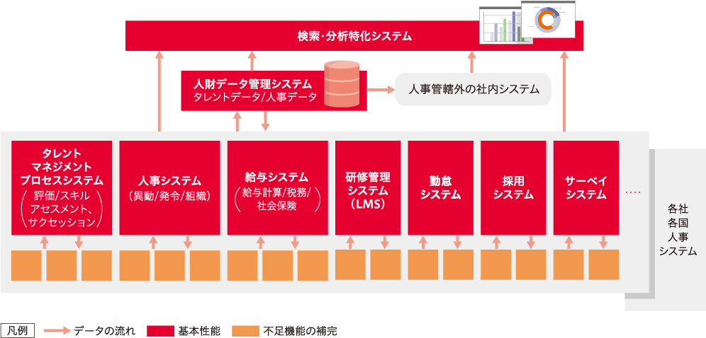 當(dāng)社グループが持続的に成長(zhǎng)可能な経営體質(zhì)をつくるためには、人財(cái)の確保?育成?生産性の向上により國(guó)內(nèi)外で成長(zhǎng)していくための人財(cái)基盤(pán)をつくり、戦略的人事を行うことが必要です。そのためには最新のIT技術(shù)やビッグデータの活用が不可欠であり、人事領(lǐng)域においても「データを管理する」ことから「データを活用する」ことが肝となります。