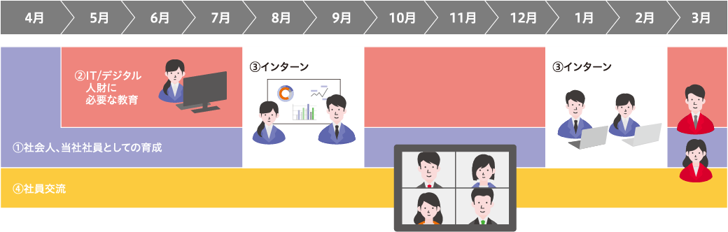 そこで2021年度の新入社員教育からは、今までの體系を抜本的に見(jiàn)直し、內(nèi)容?期間ともに一新しました。新教育は、基礎(chǔ)教育として「①社會(huì)人、當(dāng)社社員としての教育」。IT知識(shí)の偏りを排除するため、これからのIT/デジタル人財(cái)に必要とされるスキルを改めて再定義した専門(mén)教育としての「②IT/デジタル人財(cái)に必要な教育」。それらのインプットされた教育內(nèi)容を?qū)g戦でアウトプットするための「③インターン」。テレワーク下においても社員間のコミュニケーション量を増やし、多くの先輩社員から価値観や仕事に対する姿勢(shì)を生の聲から吸収するための「④社員交流」。以上、4つのカテゴリで構(gòu)成しました。また、教育期間を1年間にすることで、これらの教育を著実に行うとともに、適性を見(jiàn)た配置が可能になります。(図3)各種教育は一方的に知識(shí)を詰め込む座學(xué)だけではなく、ワークショップ形式を取り入れるなど、新入社員が長(zhǎng)期間の教育にモチベーションを高く持って參加できるよう配慮して設(shè)計(jì)しています。