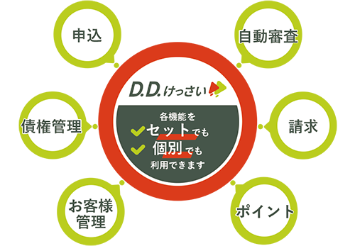 D.D.けっさいは、申込?自動(dòng)審査?債権管理?請(qǐng)求?お客さま管理?ポイントシステムを、それぞれ自由に組み合わせて利用いただくことが可能なシステムです。(図1)