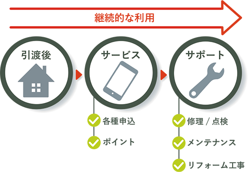 物件引き渡し後のさまざまなシーンでD.D.けっさいを通して継続的にお客さまとの接點(diǎn)を持つことで、お客さま満足度の向上につなげます。(図2)