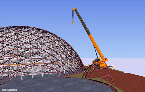 通常のXY方向の建入測定ではなく、XYZの3次元でドーム形狀の、建方精度を確保する為、少人數で管理できるツールで活用した、自動追尾の測量機を採用。外注の作業人工の削減します。