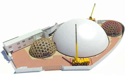 ブルーオーシャン?ドーム新築工事はNPO法人ゼリ?ジャパンが主體となる企業のパビリオンです。當社は施工を請け負っております。施工物件は、球體狀の外裝であるため、高い技術的水準が求められ、これを実現するためには、生産設計から施工までBIMを活用することが本取組において適切だと判斷しました。