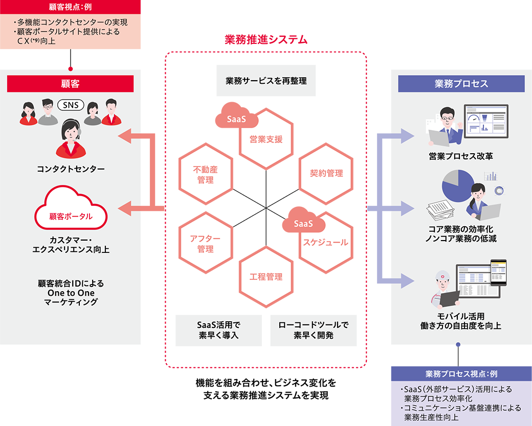 (*2)D-SMART:顧客?案件管理の営業支援機能、グループウェア機能、工程管理機能やアフターサービス機能など全従業員が利用する総合業務システム