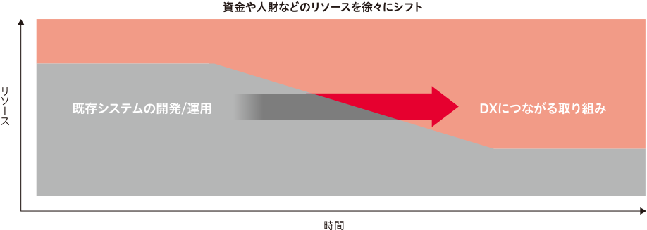 レガシーシステムの運用?保守に割かれていた資金?人財をDXにつながるような取り組みへシフトしていくことで、DXを加速させていきます。(図2)